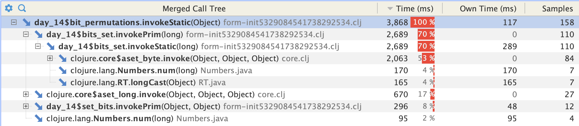 Enough preamble and onto the yak shaving. The original idiomatic clojure implementation is here and the latest and greatest here. There are two main areas where the natural approach can be improved on from a performance perspective. 80ms vs 5ms would be a worthwhile speedup if this wasn't code that gets executed once:-)