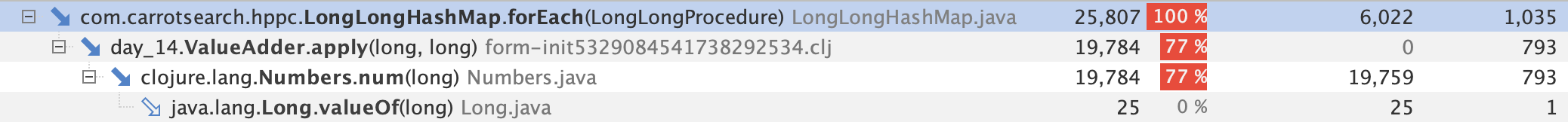 (defprotocol ValueRetriever (get-value [this ^LongLongHashMap memory])) (deftype ValueAdder [^{:unsynchronized-mutable true} ^long total] LongLongProcedure (^void apply [this ^long k ^long v] (set! total (+ total v))) ValueRetriever (get-value [this memory] (set! total 0) (.forEach memory this) total))